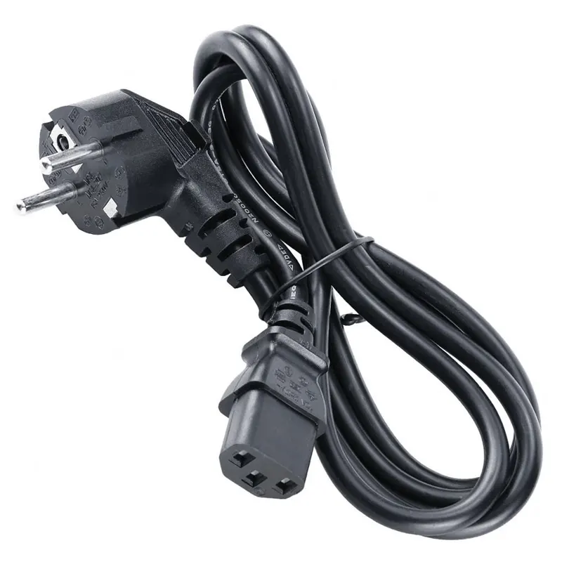 A Haing EU 2-Pin C13 power cable is a cable with a European 2-pin round plug on one end and a IEC C13 female connector (a “kettle” style connector) on the other end.