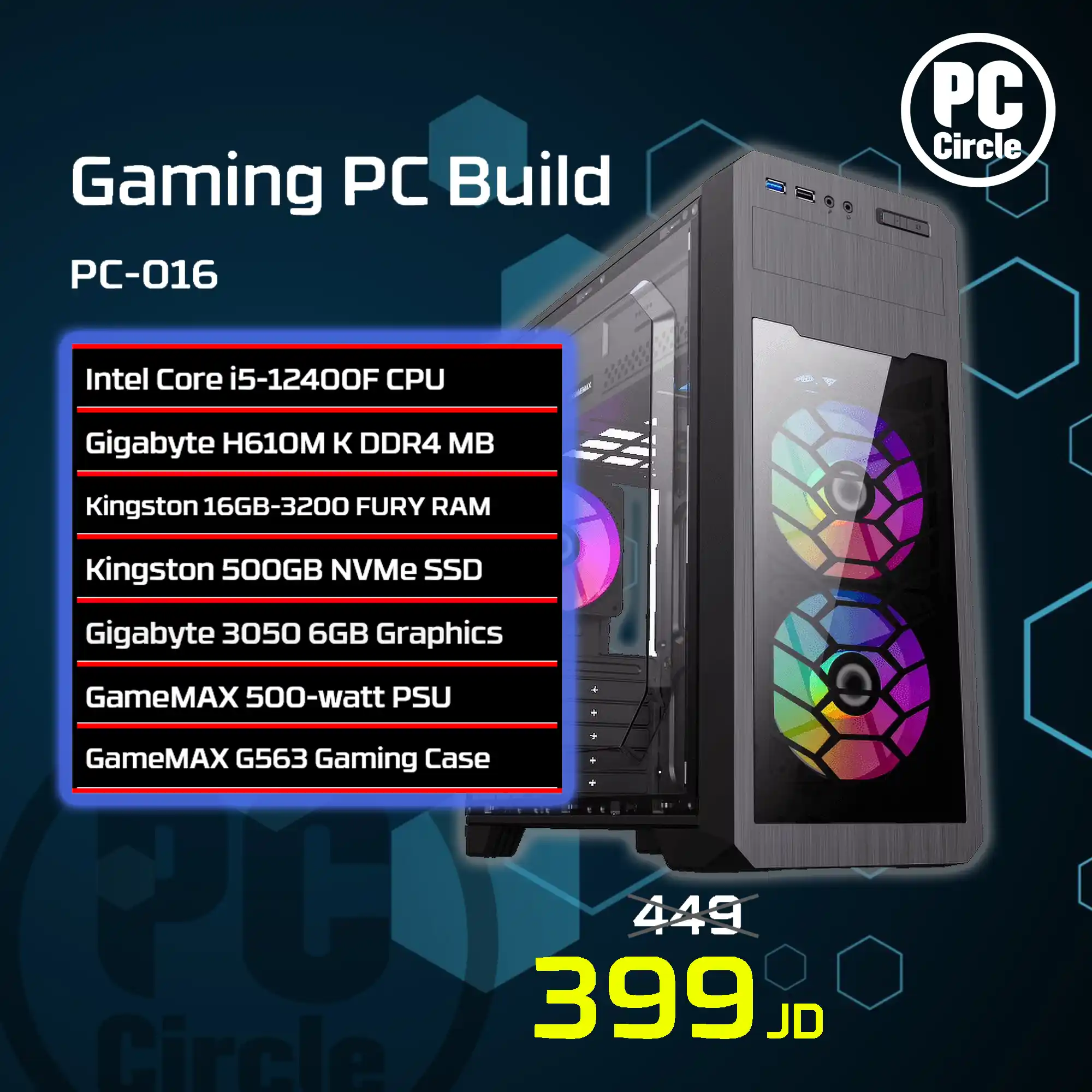 PC-016 Gaming PC Build [12th i5-12400F/Gigabyte H610M K DDR4/16GB-3200 RAM/500GB NV3 SSD/Gigabyte RTX 3050-2Fans-6GB/GameMax G563 Mid Gaming Case/GameMax 500-watt PSU]